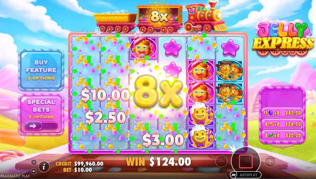 Jelly Express използва решетка 6×5 с механика за разпръснати изплащания. Това означава, че не са ви нужни традиционни платежни линии; вместо това просто трябва да кацнете 8 или повече съвпадащи символа навсякъде на екрана, за да осигурите печалба. Играта разполага и с система за падащи ролки, при която печелившите символи изчезват, позволявайки на нови да паднат за потенциални последователни печалби.