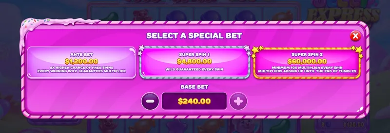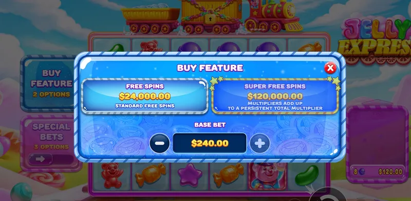 Jelly Express е подходящ за различни банкроли с минимален залог от 0,20 и максимален залог от 240 на завъртане. Тази гъвкавост позволява на случайни играчи и играчи с висок риск да регулират стратегията си според бюджета и високата дисперсия на играта.
